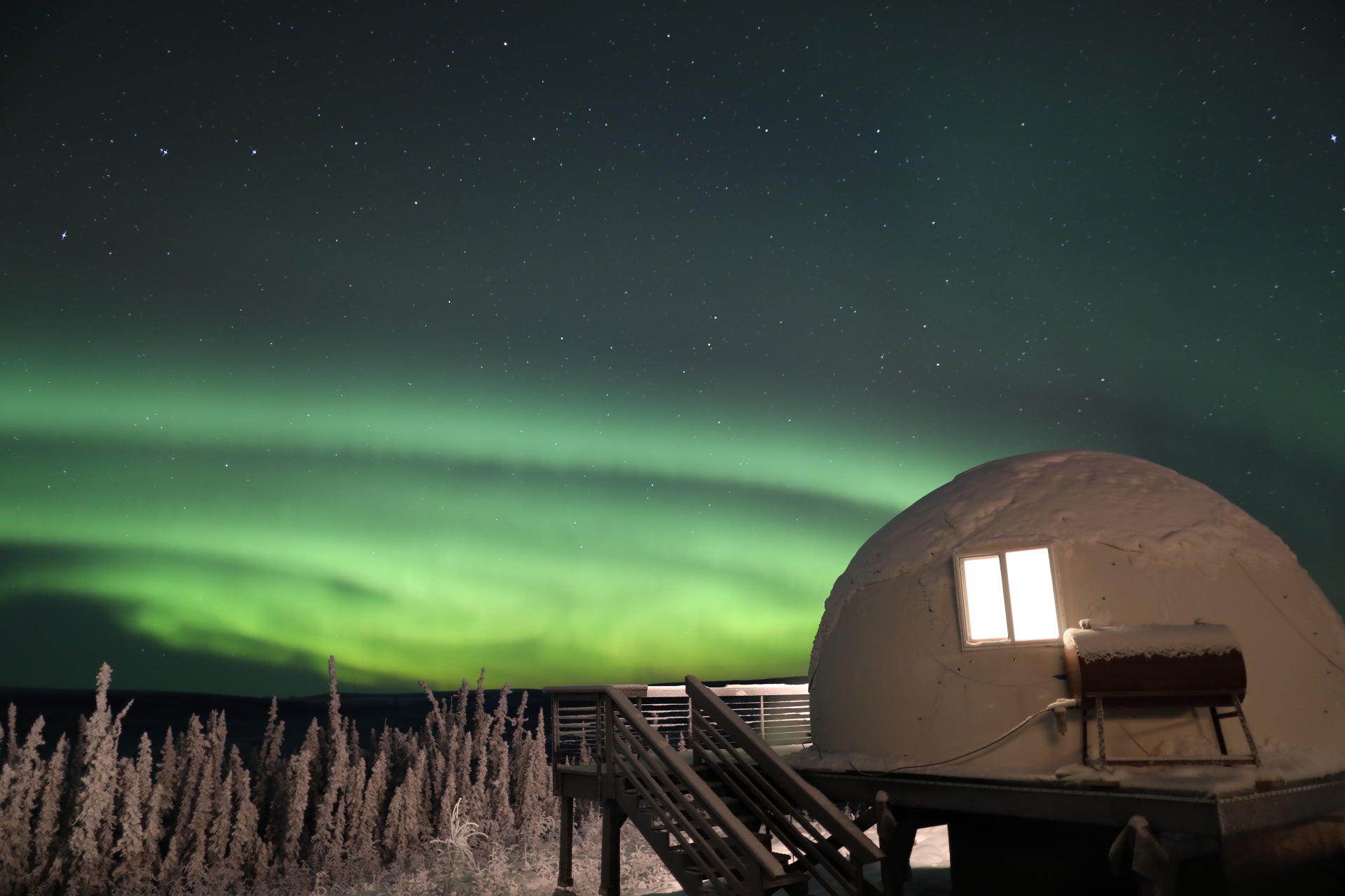 Our Planet Cabin is located on the outskirts of Fairbanks, on a mountain in the suburbs without any buildings blocking the view, away from city light pollution, giving you the best aurora viewing experience.